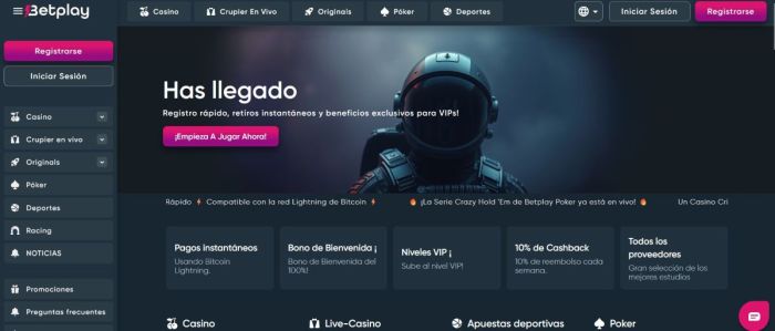 - Variedad de juegos: incluyen slots, blackjack, baccarat, juegos crash, ruleta, póker, dados, minas, apuestas deportivas y más.