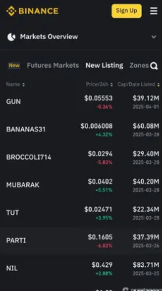 若想查看 Binance 新上市的代幣,可以前往 Binance 平台中的 “New Listings” 頁面。該頁面會列出所有最新上市的代幣,並且可以根據價格、24 小時價格變動、市值和上市日期等條件進行排序與篩選,方便用戶掌握市場最新動態。