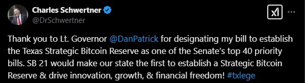 Ο Ρεπουμπλικανός Γερουσιαστής του Τέξας, Charles Schwertner, ανακοίνωσε την πρότασή του για το «Texas Strategic Bitcoin Reserve and Investment Act» (SB21). Αυτό θα επιτρέψει στην πολιτεία να επενδύει και να διαχειρίζεται αποθέματα Bitcoin και άλλων ψηφιακών περιουσιακών στοιχείων υψηλής κεφαλαιοποίησης.