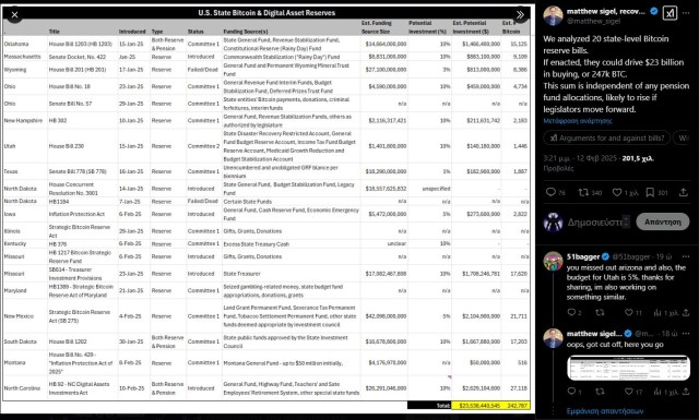 Η ανάλυση του MatthewSigel της VanEck αφορά 20 πολιτείες που εξετάζουν την ψήφιση νομοθεσίας για τη δημιουργία στρατηγικών αποθεματικών Bitcoin.