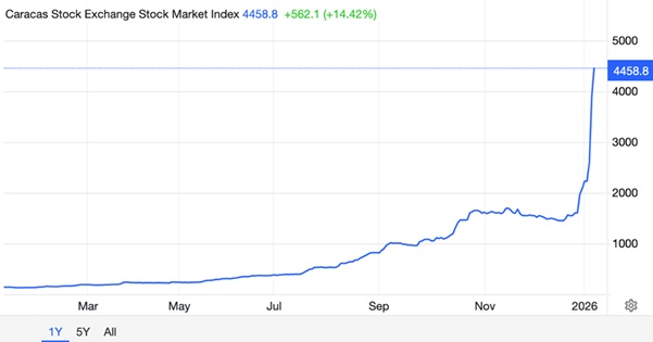 委內瑞拉的主要股指——卡拉卡斯證券交易所指數自年初以來已飆升 172.3%,特別是在美國抓捕委內瑞拉總統尼古拉斯·馬杜羅後,漲勢更為迅猛。
