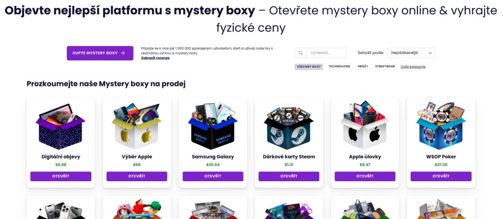 Nabídka boxů zahrnuje nejen módu, ale i elektroniky, herní doplňky nebo lifestyle produkty. Každý box obsahuje mix produktů s různou šancí na výhru, což přidává prvky napětí i zábavy. Ideální volba pro všechny, kteří chtějí otestovat štěstí a přitom se dobře pobavit. Pokud tě baví vizuálně atraktivní rozhraní a rychlá hra, rozhodně stojí za to zde pokračovat.