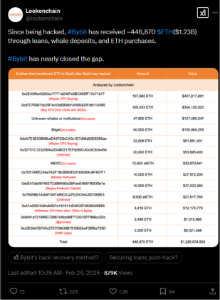 После атаки платформа незамедлительно начала восстанавливать ликвидность. По данным Lookonchain, за два дня ByBit привлекла 446 870 ETH (примерно $1,23 млрд) за счет займов, крупных депозитов и покупок Эфира.