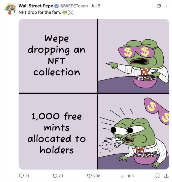 ความสนใจในการซื้อ WEPE ที่เพิ่มมากขึ้นสะท้อนให้เห็นในโซเชียลมีเดีย โดย บัญชี X ของโครงการมีผู้ติดตามถึง 55,300 ราย ร่วมกับธนาคารเนื้อหามีมที่ผู้ใช้สร้างขึ้นจำนวนมาก