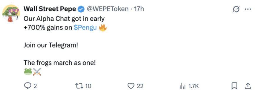 WEPE Alpha Chat ให้ผลกำไร 700% บวกกับ PENGU