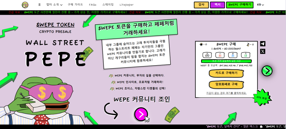 마케팅에 $WEPE 토큰 무려 760억 개를 할당해 초기 펀딩 단계에서 월스트리트 페페의 프리세일을 적극적으로 홍보하여 투자자를 유치합니다.