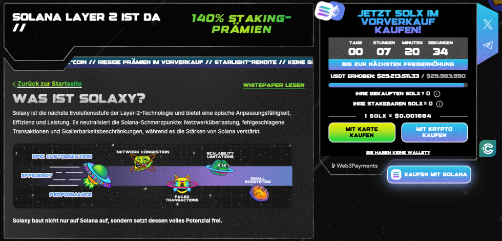 Das dahinterstehende Projekt Solaxy fällt vor allem durch sein großes Wachstumspotenzial auf. Die Entwickler wollen hier nämlich die erste Layer-2-Blockchain für das Solana-Ökosystem entwickeln, um Problemen wie Netzüberlastung und Transaktionsverzögerungen entgegenzuwirken, die Solana vor allem in Hypephasen belasten.