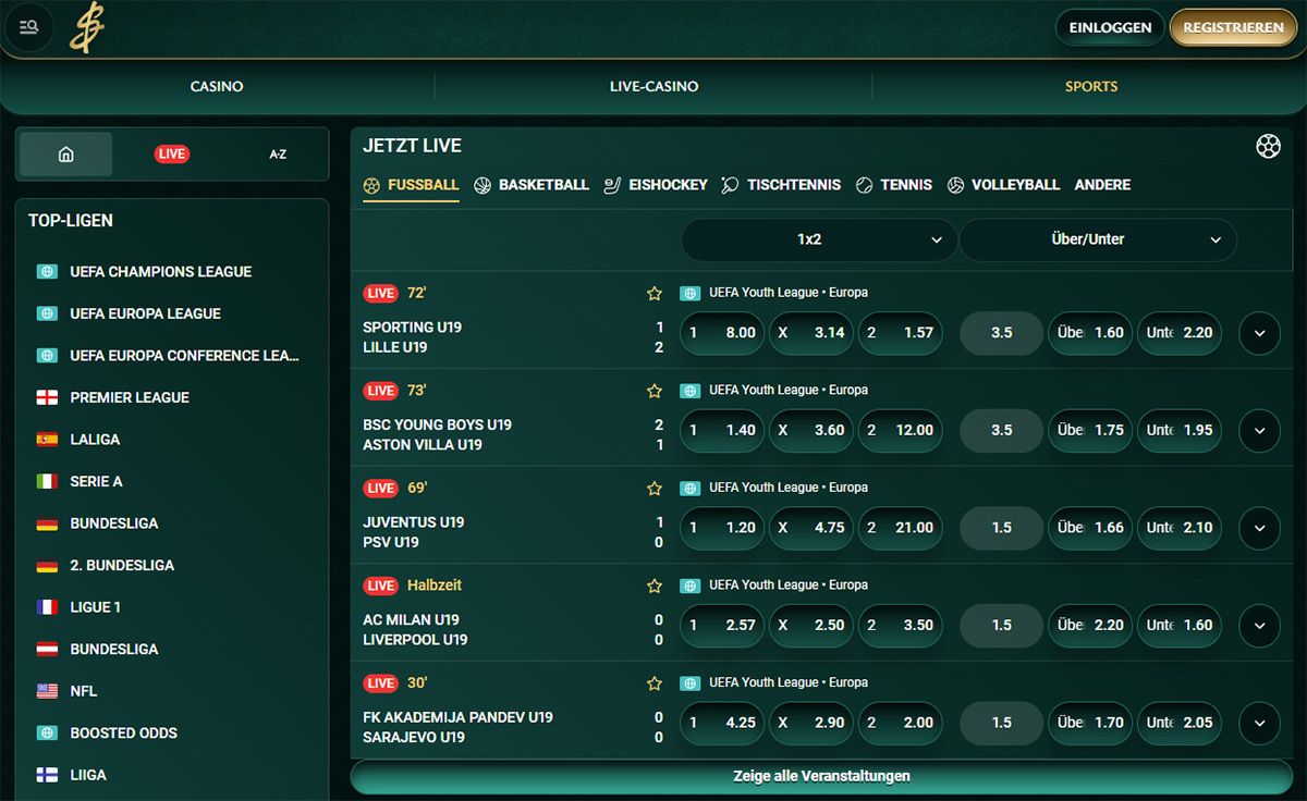Neben den Sport- und Live-Wetten haben die Betreiber für Pferderennen und Virtuellen Sport eine eigene Kategorie eingerichtet. Sie können Ihre Tipps auf über 40 Sportwetten ohne OASIS abgeben. Auch die Tiefe der Märkte ist sehr gut. Cashed zeichnet sich speziell als Fußball Wettanbieter ohne OASIS aus. Im Deutschen Fußball sind auch Ober- und Regionalligen und die Bundesliga der Frauen im Angebot.