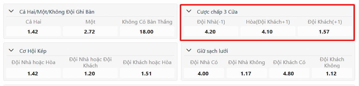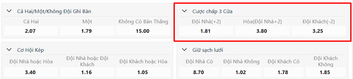 Các cửa cược xuất hiện trong kèo cược chấp 3 cửa gồm: