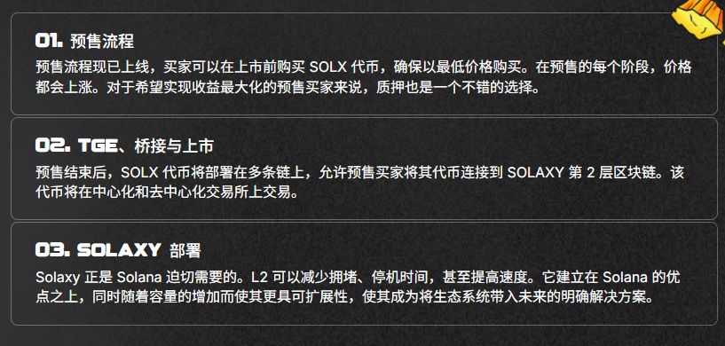 Solaxy 是一個建構在 Solana 上的 Layer 2 擴容項目,旨在提升交易速度、降低手續費並減緩主網擁堵。其原生代幣 $SOLX 是整個生態系的燃料,可用於質押(Staking)獲取獎勵。