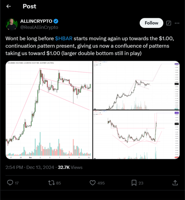 Hedera is up 167% in the past month; trading at $0. 2949 at the time of press. HBAR has been one of the high-performing cryptos since November. It shot to $0.392 on December 3, recording a whopping 820% rise. Having dropped from this high, the coin seems to be in correction. Analysts hold a bullish outlook on HBAR. One of the analysts named ALLINCRYPTO says NBAR could go as high as $1. Could HBAR be among the must-have cryptocurrencies this year?