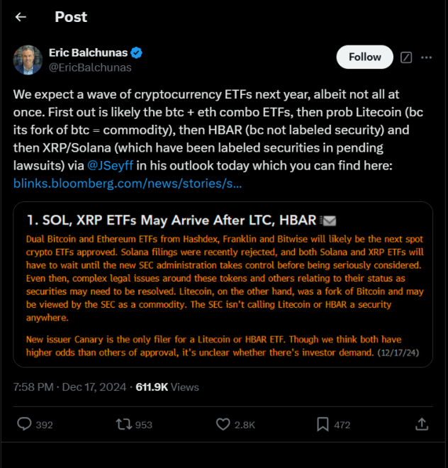 Today BlockBoost ($BBT), Hedera (HBAR), and Litecoin are making waves, with the market holding positive sentiments. An analyst, Eric Balchunas suggests that HBAR and LTC are among the cryptocurrencies to expect ETFs from in 2025. This would only mean more institutional adoption and a price rally for the two coins.