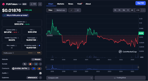 In a market where most tokens have struggled to hold momentum, FUNToken ($FUN) has emerged as one of 2025’s standout performers. Trading around $0.0187 at the time of writing, FUN has nearly tripled in value since early April, when it traded below $0.007, according to CoinMarketCap.