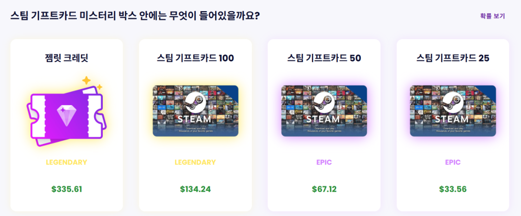- 원하는 블라인드 박스 테마(예: 스팀 기프트카드)를 선택하여 구매한다. 또한 포인트를 적립하면 매력적인 추가 혜택을 누릴 수 있다.