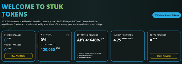 TUK token staking is now live too, offering a remarkably high APY of 41,646% at the time of writing.