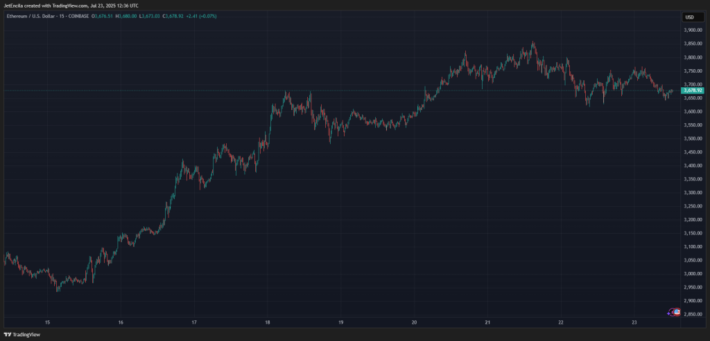 Sul fronte di mercato, Ethereum ha risposto con nuove candele verdi. Il token è salito del 2% nelle ultime 24 ore, toccando un massimo giornaliero di 3.763 $. Nella scorsa settimana, ETH è cresciuto del 20%, e nell’ultimo mese ha registrato un incremento del 65%. L’interesse istituzionale sembra dunque contribuire a sostenere il trend rialzista in corso.