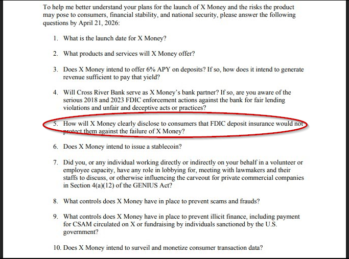 Warren’s letter asked whether X Money customers would be clearly informed that their funds carry no federal backstop. It’s a basic consumer question — one that hasn’t been publicly answered.