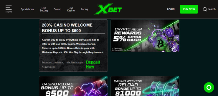 You can also find two other XBet promo code casino reload bonuses. The first is almost identical to the welcome offer in terms of its T&Cs, but the deposit match is 50%, not 200%.