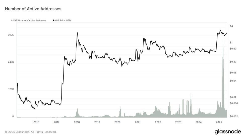 จำนวนกระเป๋าเงินที่มีการเคลื่อนไหวบนเครือข่าย XRP พุ่งแตะระดับสูงสุดเป็นประวัติการณ์ในเดือนมีนาคม 2025 ก่อนจะร่วงลงอย่างรวดเร็วกว่า 90% ในช่วงเวลาถัดมา กลับสู่ระดับก่อนช่วงราคาพุ่งแรง ซึ่งเป็นลักษณะที่เคยเกิดขึ้นในช่วงปลายปี 2017 และต้นปี 2021 เช่นกัน