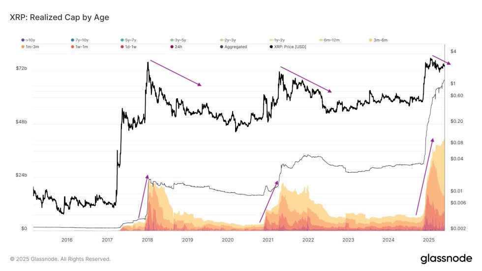 ข้อมูลจาก Glassnode เสริมภาพรวมดังกล่าว โดยรายงานว่า realized market capitalization ของ XRP ซึ่งคำนวณจากราคาที่แต่ละโทเค็นมีการเคลื่อนไหวครั้งล่าสุด ได้เพิ่มขึ้นอย่างรวดเร็วในช่วงระหว่างปลายปี 2024 ถึงต้นปี 2025 โดยเฉพาะในกลุ่มโทเค็นที่ถือครองมาเพียง 3–6 เดือน ซึ่งเป็นตัวแทนของนักลงทุนระยะสั้น