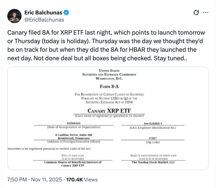- 提出されたForm 8-Aとナスダックの認証待ち状況から、「Canary XRP ETF」は今週木曜日にも上場する可能性が高い。