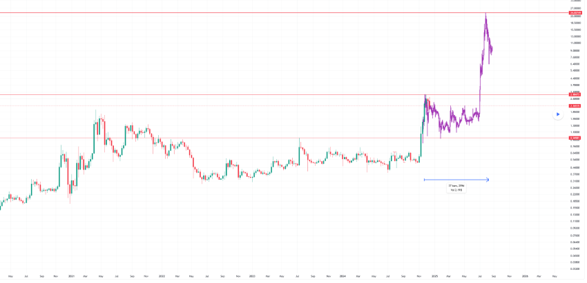 De afbeelding hierboven laat zien hoe XRP zich structureel beweegt. De grafiek bevat historische data vanaf 2017, met een break-out structuur die zich eind 2024 herhaalt. De paarse projectie toont wat er mogelijk is als dit patroon zich herhaalt.
