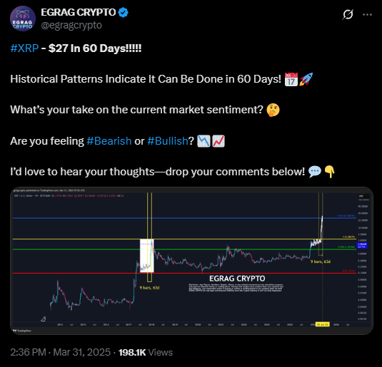 อย่างไรก็ตาม นักวิเคราะห์คริปโต EGRAG CRYPTO มองว่าสถานการณ์นี้เป็นเพียงภาพระยะสั้น และคาดการณ์ว่าราคา XRP จะมีการระเบิดในอีก 60 วันข้างหน้า โดยอ้างอิงจากรูปแบบราคาในอดีตที่เคยเกิดขึ้นในปี 2018 ซึ่ง XRP มีการปรับตัวขึ้นอย่างรวดเร็วใน 63 วัน ทำสถิติสูงสุดที่ 2.44 ดอลลาร์ ก่อนที่จะถูกทำลายในเดือนมกราคม 2025 นักวิเคราะห์เชื่อว่ารูปแบบเดียวกันนี้อาจเกิดขึ้นอีกครั้ง