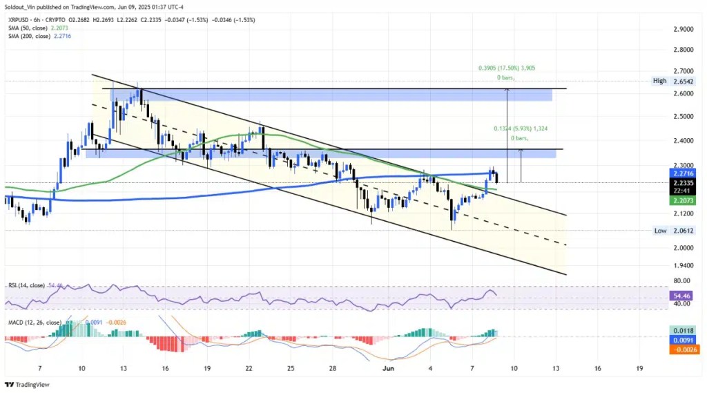 XRPの6時間足チャートでは、いくつかの主要指標に基づき、強気の値動きが示されている。50期間単純移動平均線(SMA)は2.20ドル(約345円)で推移しており、200 SMAは2.271ドル(約356円)に位置する。一方、6月4日にはデスクロスが発生しており、今後の弱気転換の可能性を示唆するシグナルとも受け取れる。