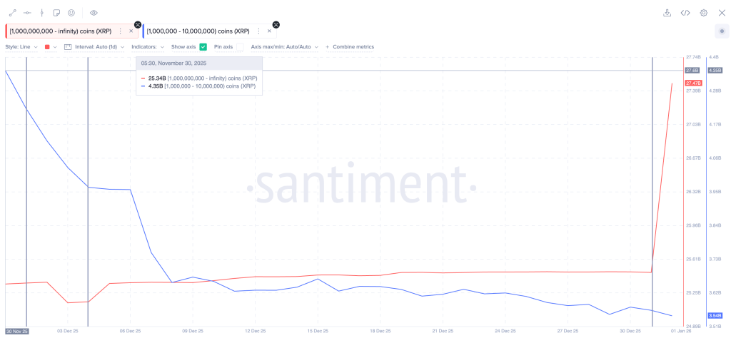 Santimentのデータでは、十億トークン以上を保有する大口投資家が、十二月三十一日から一月にかけて約三十六億ドル(約五千二百億円)相当のXRPを追加購入した。