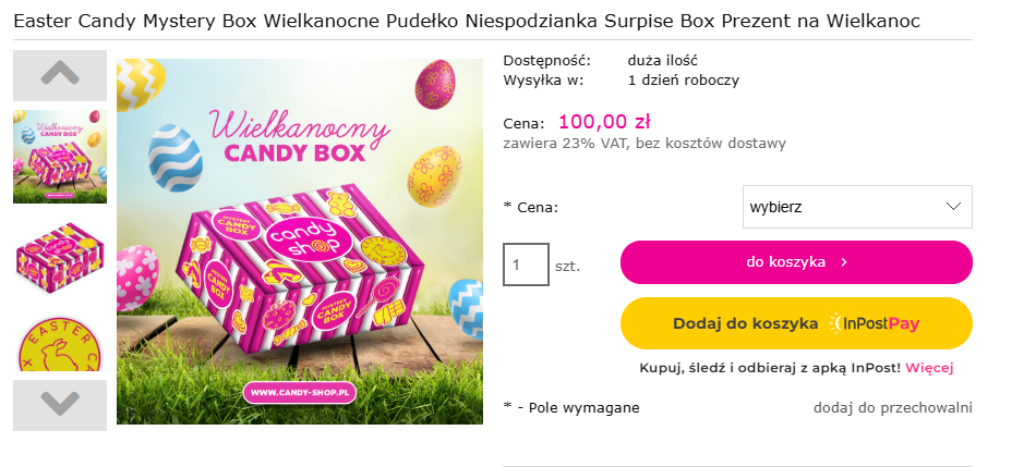 Inną stroną wartą polecenia jest Candy Shop. Strona wydaje się być bogata w tajemnicze paczki pełne słodkości, więc nie dziwota, że znajdujemy na niej także wielkanocny mystery box. Ten posiada w sobie od 8 do nawet 18 produktów, jako że dostępne są trzy wielkości takiego pudełka. Chociaż, trzeba mieć na uwadze, że naturalnie każdy wariant jest dostępny w innej cenie.