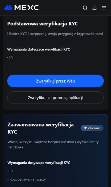 Zaloguj się na swoje konto i przejdź do zakładki „Identyfikacja”. Wybierz weryfikację podstawową lub zaawansowaną. W przypadku tej pierwszej opcji prześlij skan lub zdjęcie swojego dowodu osobistego. W zaawansowanej weryfikacji musisz dodatkowo ustawić rozpoznawanie twarzy. Bez weryfikacji skorzystasz jedynie z handlu spot i futures.